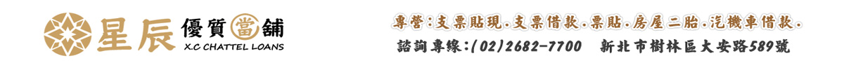 新北市首選星辰優質當舖,本公司政府立案,合法經營,誠信可靠,公定利息,手續簡便,放款迅速,銀行式經營,汽車借款、機車借款有保障,是大家的現金救急站,您資金調度的好地方。